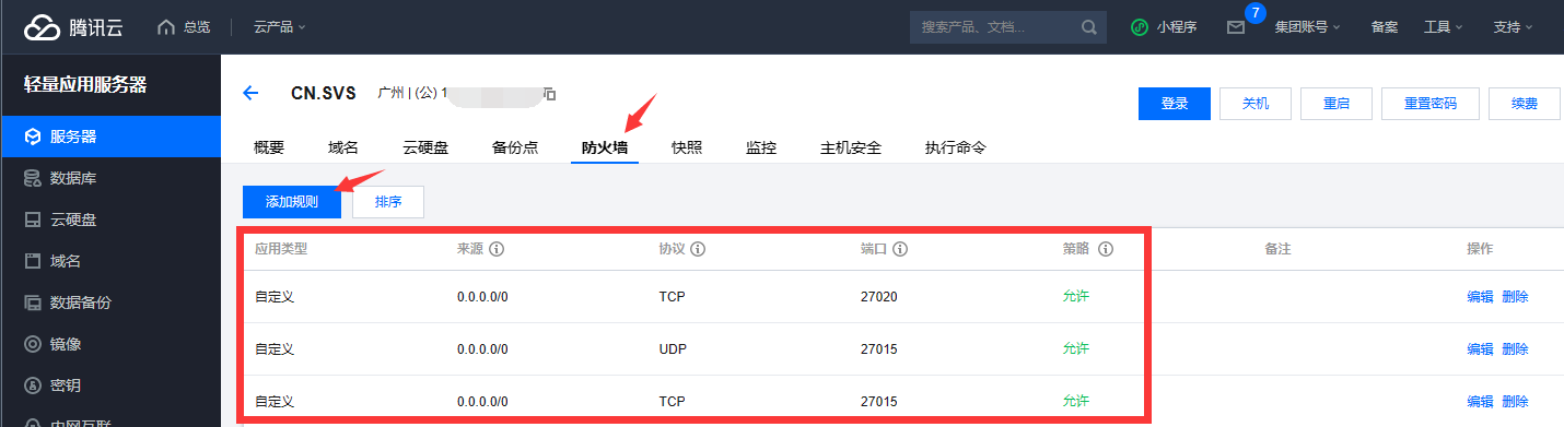 6.前往服务器后台开放27015的UDP/TCP端口(游戏默认端口)和27020的TCP端口(GOTV的默认端口)